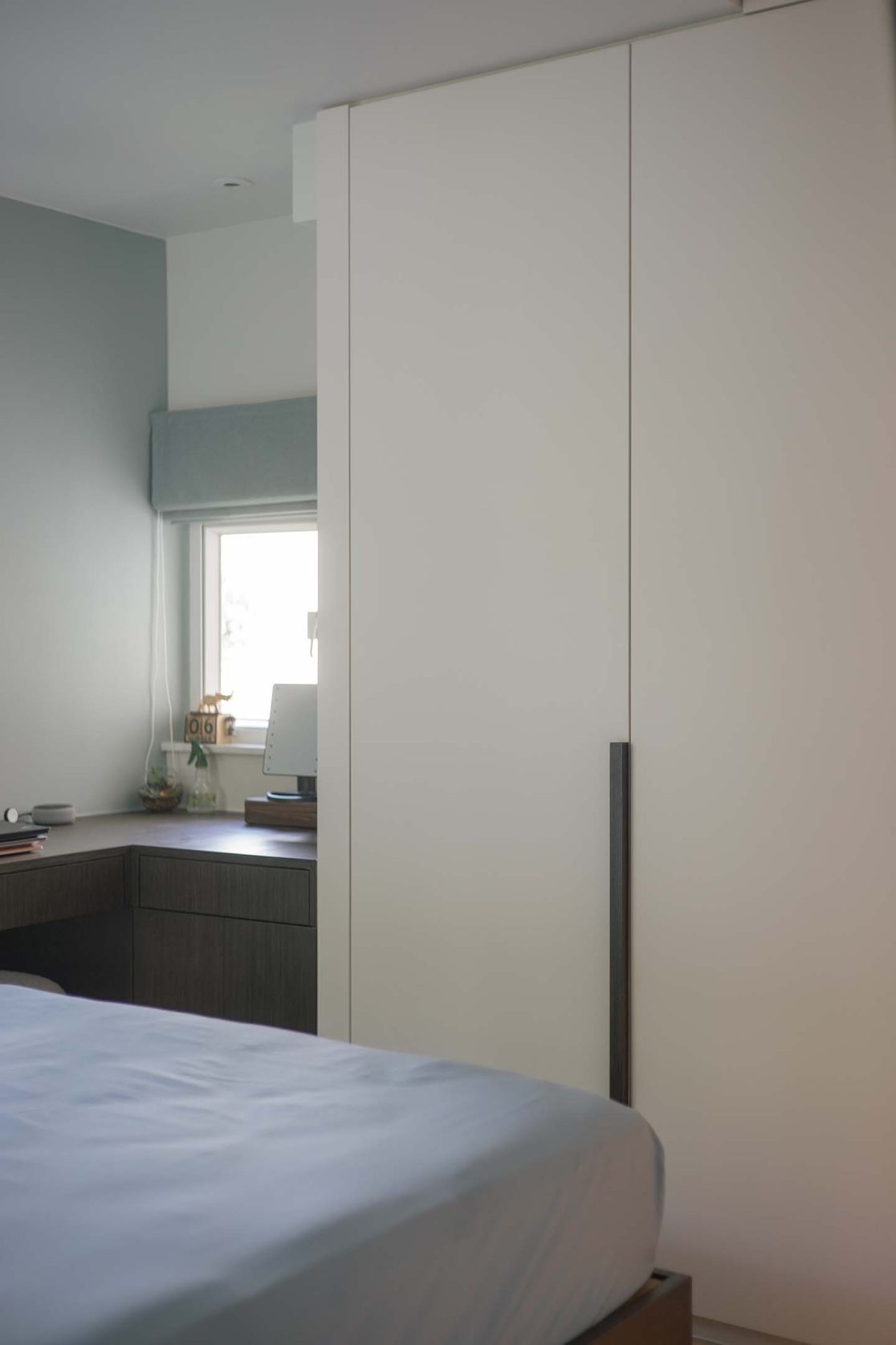 The style of interior is dominated by white main color, with modern design and natural dark wood matarials to create a cozy interior space.