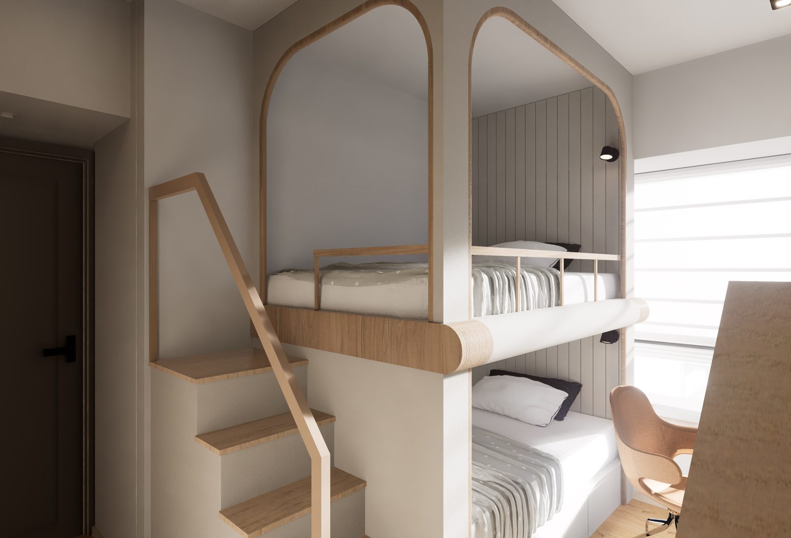 The children’s room features distinctive bunk beds, adding a playful element, and is accompanied by a gray-green wardrobe. In the bathroom, natural wood tones and characteristic tiles in a lake-green shade create a harmonious and tranquil atmosphere.